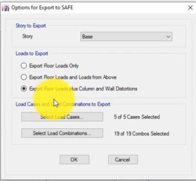 Thông thường khi export trực tiếp từ Etabs sang Safe, người dùng hay chọn trường họp thứ 3 (xuất tải trọng sàn, tải trọng các sàn phía trên và kể đến biến dạng của cột và vách),