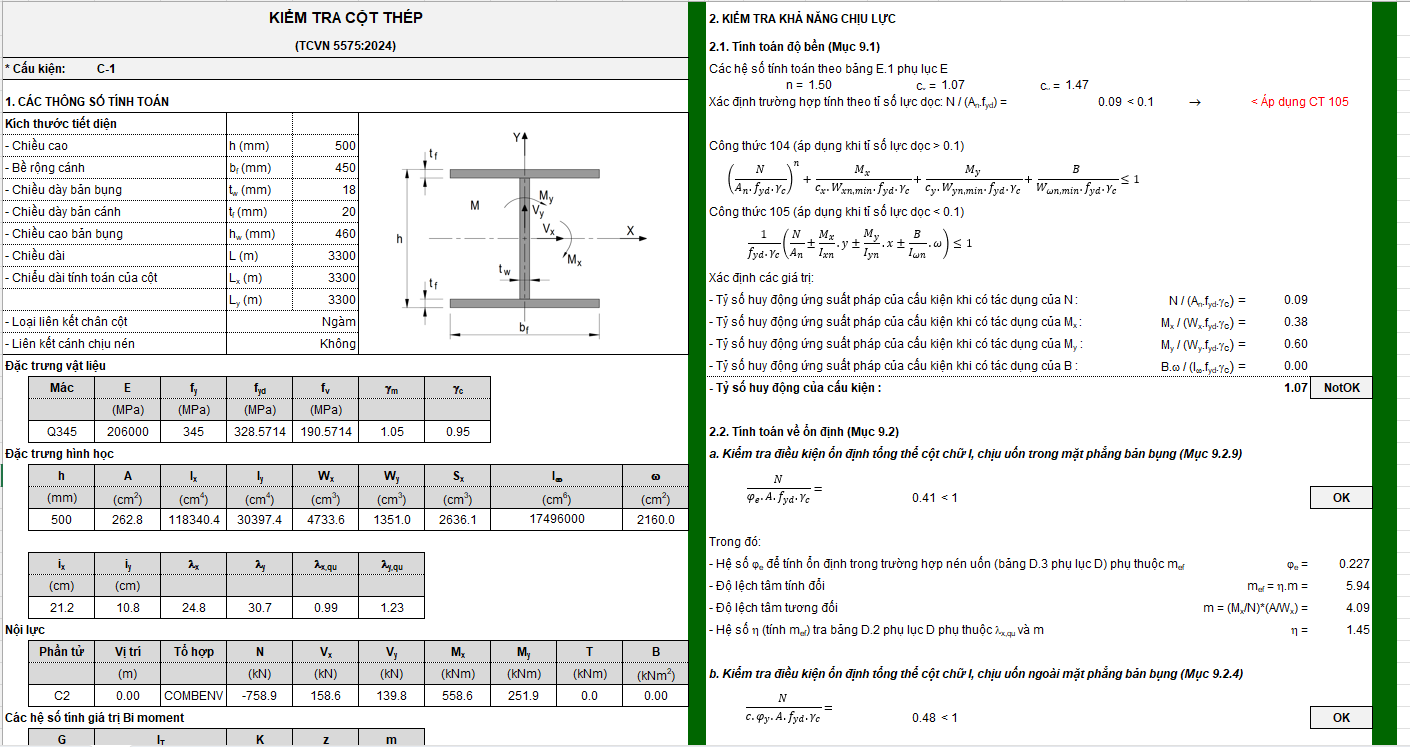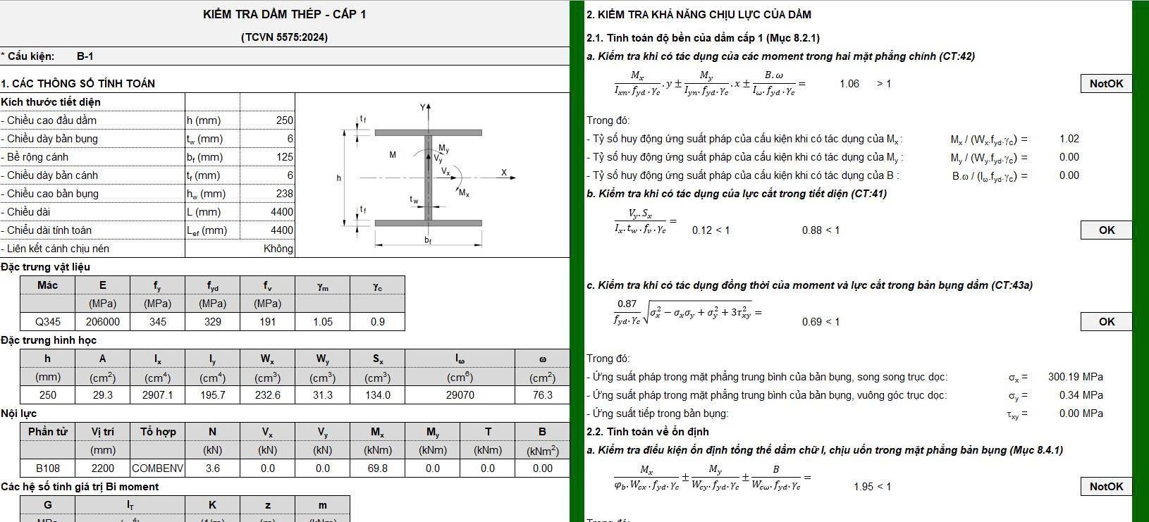✔️ Kiểm tra các cấu kiện theo TCVN: Phần mềm hiện đang áp dụng TCVN 5575:2024 để kiểm tra khả năng chịu lực và điều kiện làm việc của các cấu kiện bê tông cốt thép.