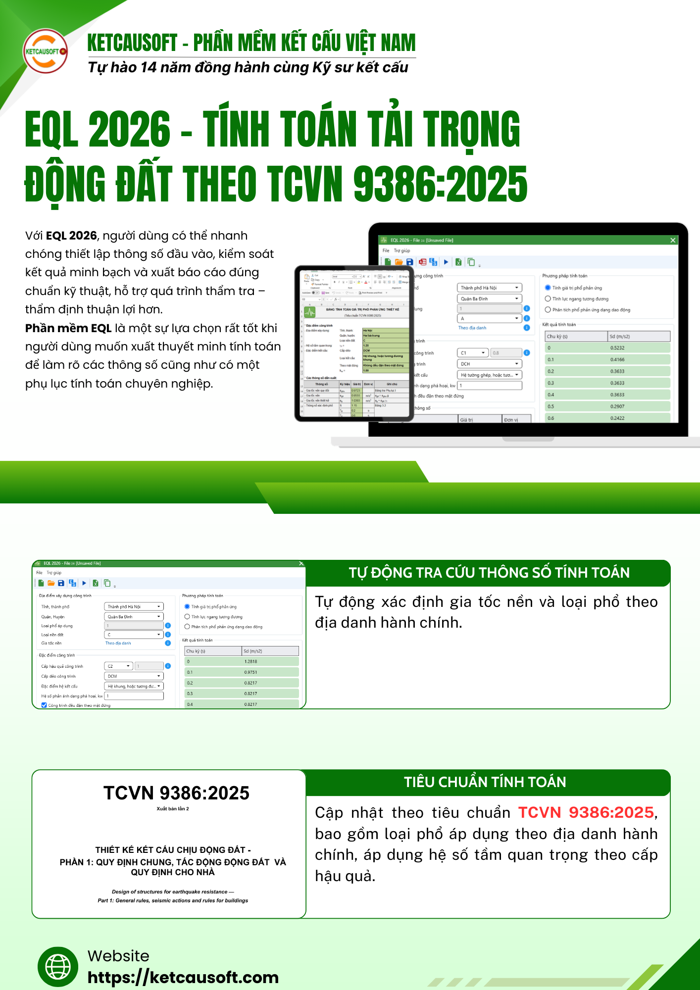 Phát hành EQL 2026 - Phần mềm tính toán tải trọng động đất theo TCVN 9386:2025 - Tính năng || KetcauSoft