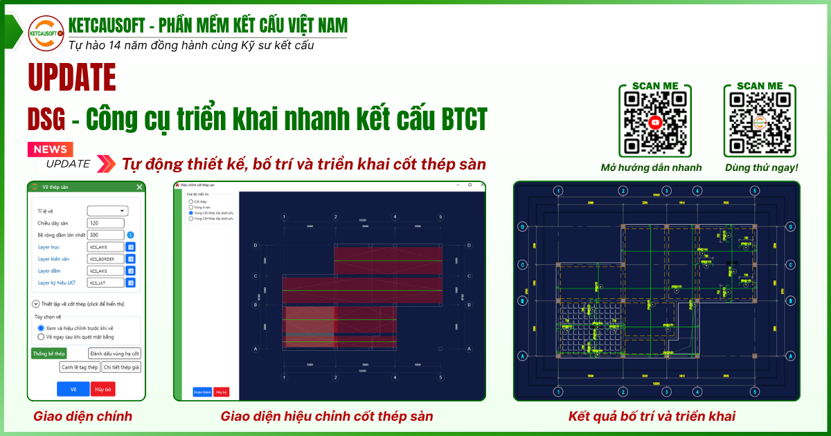 Niềm tự hào của chúng tôi là đã xây dựng được KetcauSoft không chỉ là tập hợp của một số phần mềm, KetcauSoft là một hệ thống hoàn chỉnh cho quy trình thiết kế kết cấu, từ các bước tính toán, thiết kế, thể hiện bản vẽ, biên tập và xuất bản hồ sơ; đi kèm theo đó là những hướng dẫn để các bạn có thể thực hiện các nội dung đó một cách thuận tiện nhất !