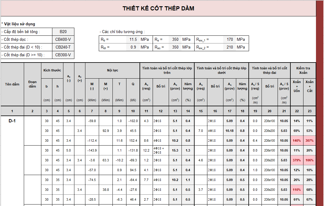 Chỉ cần quét chọn dầm trên mô hình, phần mềm sẽ tự động tính toán và thiết kế cốt thép cho dầm đó, xác định tiết diện nguy hiểm và đề xuất phương án bố trí theo TCVN 5574:2018. Người dùng có thể chỉnh sửa linh hoạt theo yêu cầu thiết kế và thi công.
