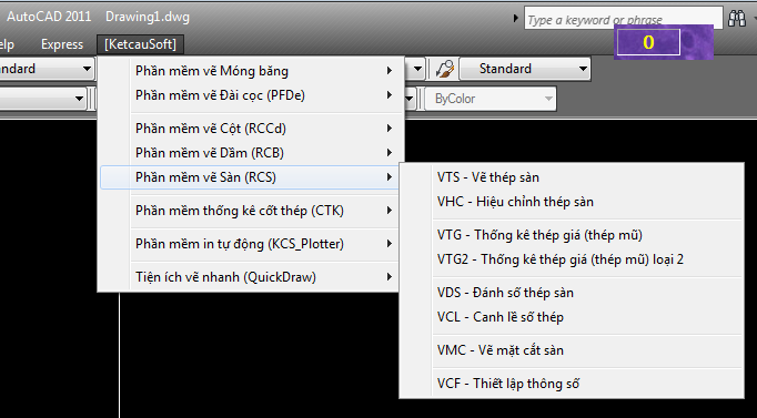 Sau khi hoàn thành các bước trên, menu KetcauSoft sẽ được hiển thị trên thanh menu chung của AutoCAD. Trong menu này là các menu con chứa các lệnh tương ứng của các phần mềm. Các chữ cái viết hoa thể hiện lệnh tắt mà bạn có thể sử dụng.