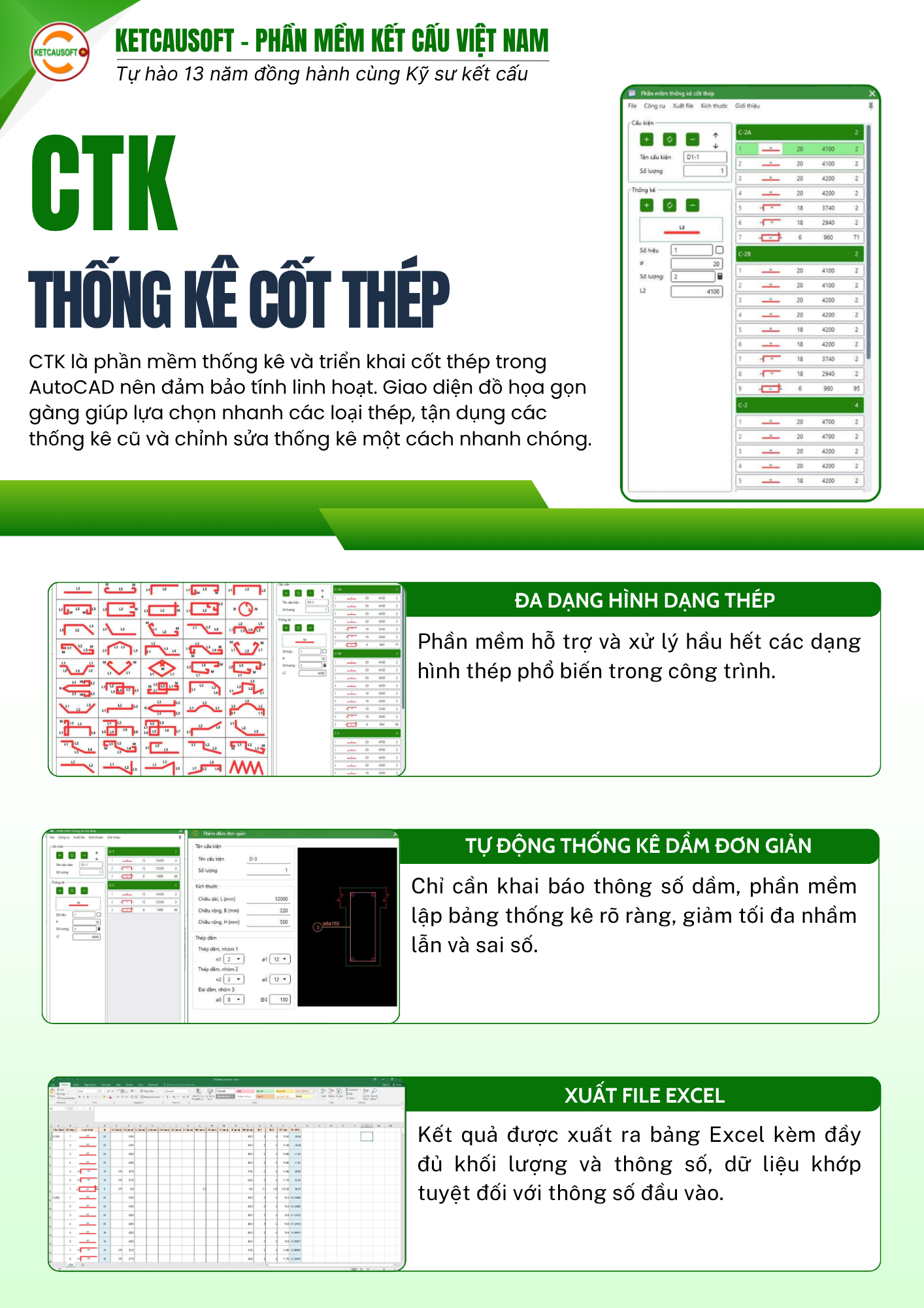 Cùng KetcauSoft khám phá các tính năng nổi bật của phần mềm Thống kê cốt thép (CTK) dành cho Kỹ sư Kết cấu.